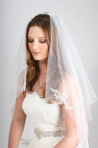 Delicate sequinned lace is combined with a simple edge for a subtle yet effective look. In between the lace applique pieces is pearl and crystal embellishment. This veil comes with two tiers and is half combed as standard but can be requested with one tier, or fully combed.